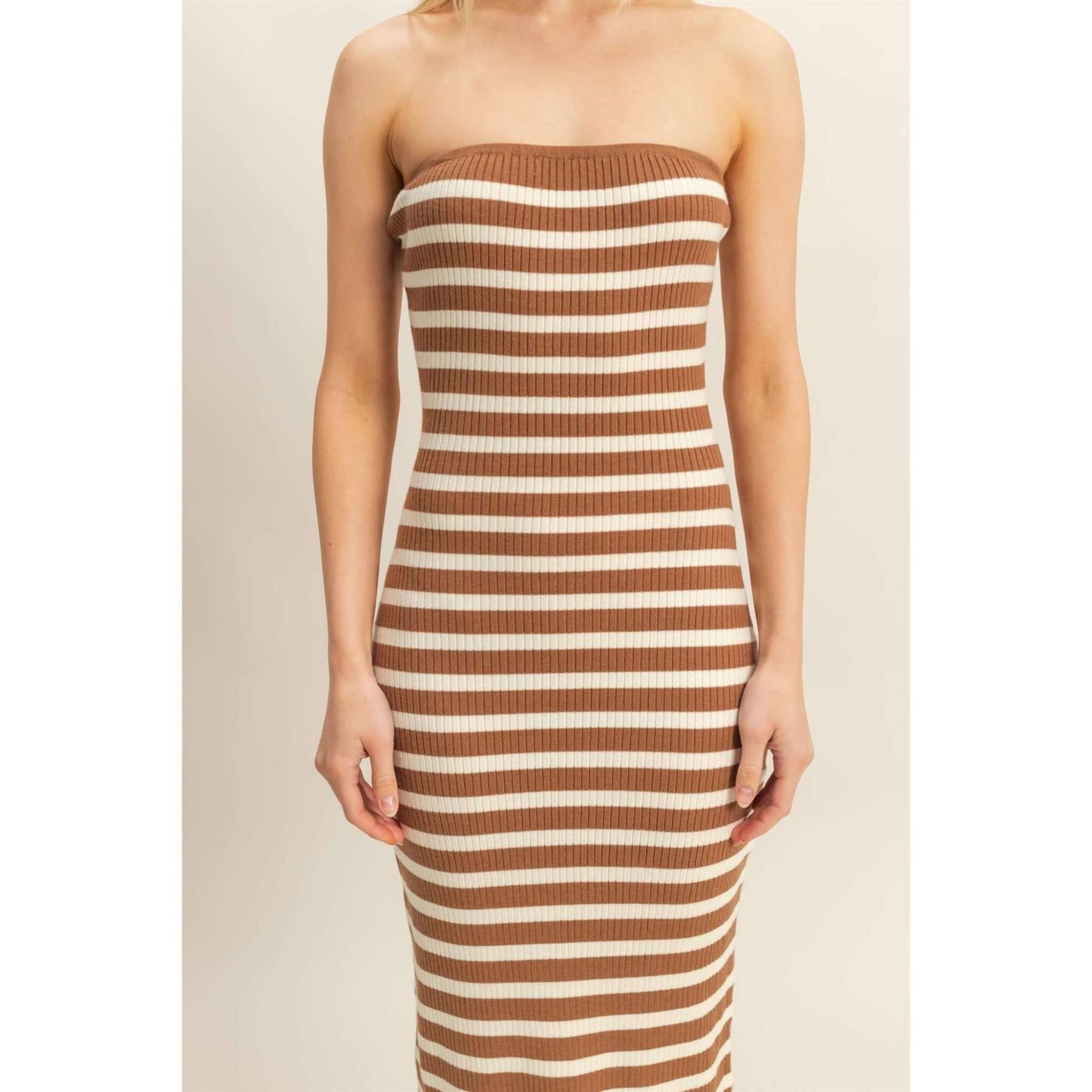 Introducing our set, a chic, coordinated knit set that features a striped cardigan and matching midi dress, showcasing a harmonious blend of comfort and style. The top presents a classic V-neckline complemented by front button closures, offering a relaxed yet refined look. Model Is 5' 6" Tall, 32" Chest, 24" Waist, 32" Hips And Wearing A Size SmallÂ