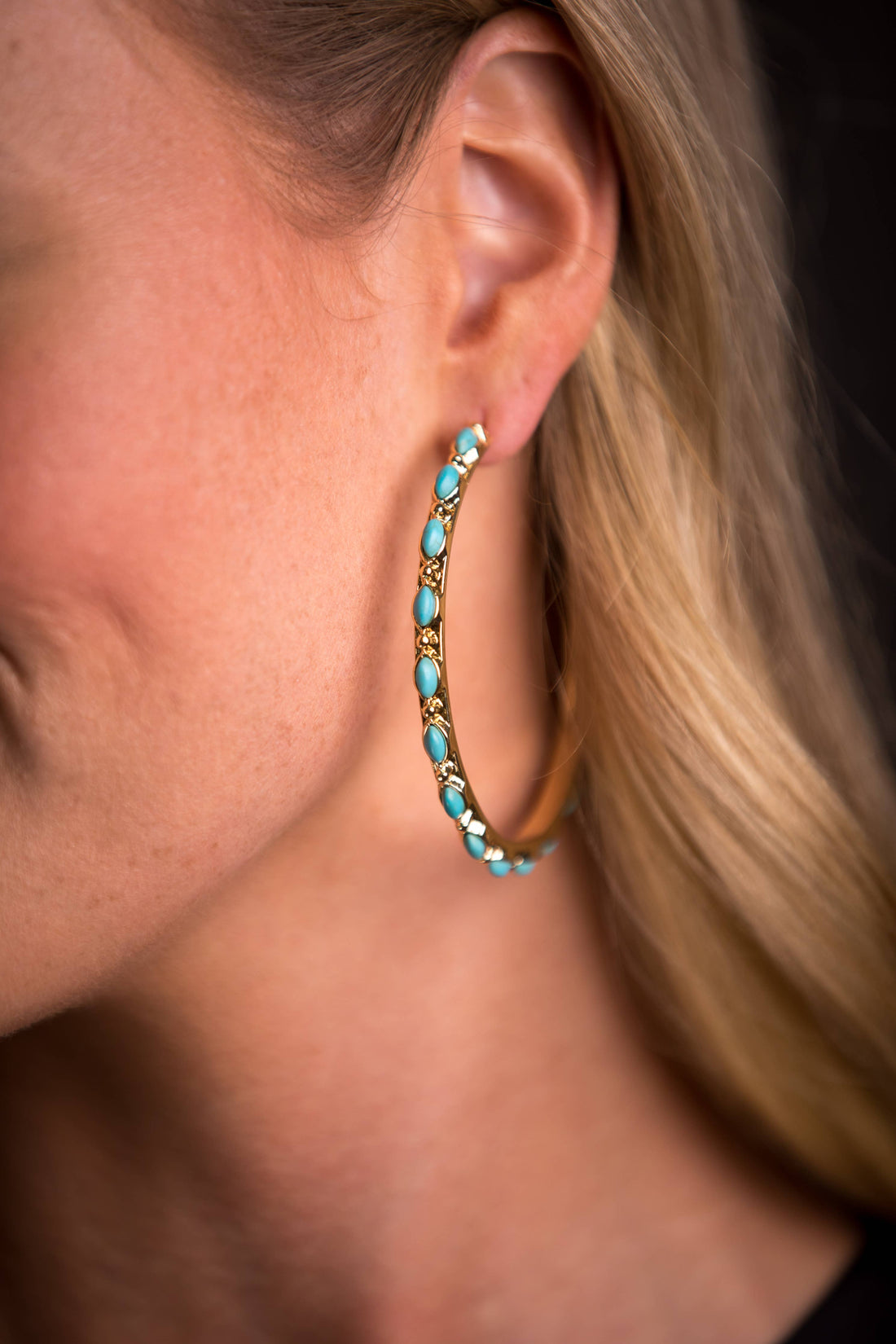2.5" Gold and Turquoise Petitie Point Style Hoop Earring