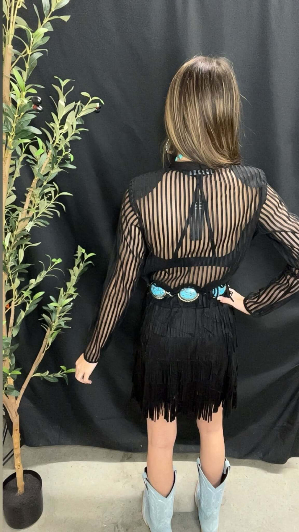 Lucky & Blessed Black Mesh Tiered Suede Fringe Zip Up Shirt Dress