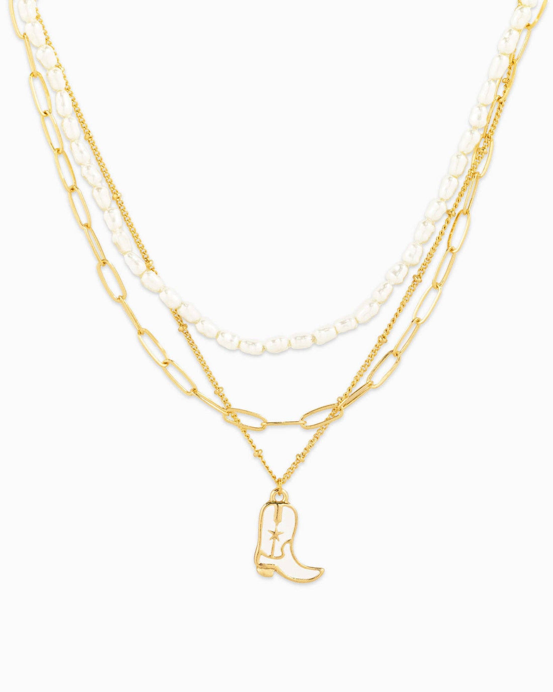 Elevate your western style with our Triple Layer White Cowboy Boot Pendant Necklace! The white...
