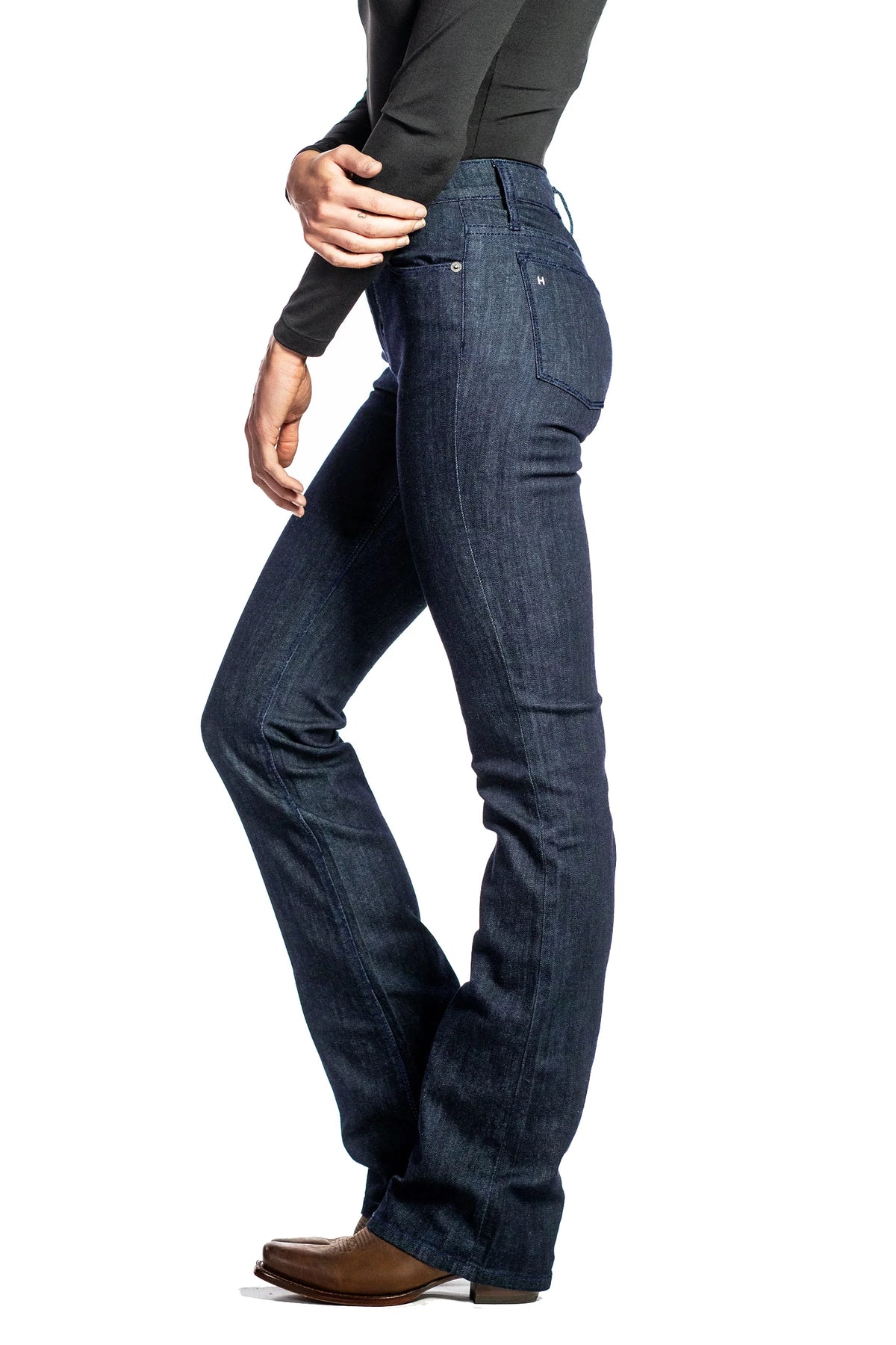 THE FIT : VENICE is a tailored bootcut. A 'modern western' silhouette that fits over boots without excess fabric. Our bootcut has a 1 inch wider leg opening than the straight leg and offers a touch more room in the knee. A medium rise paired with a contoured waistband avoids gapping in the waist when sitting or riding. Flattering for all shapes and figures.