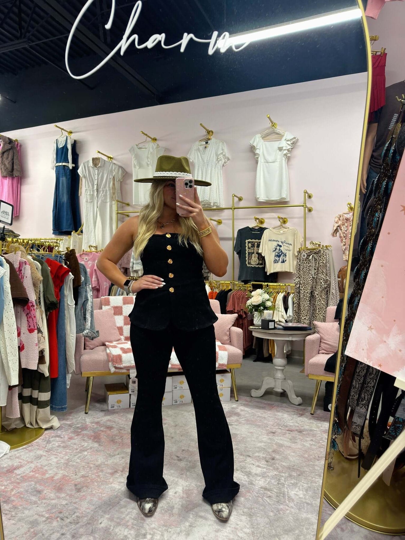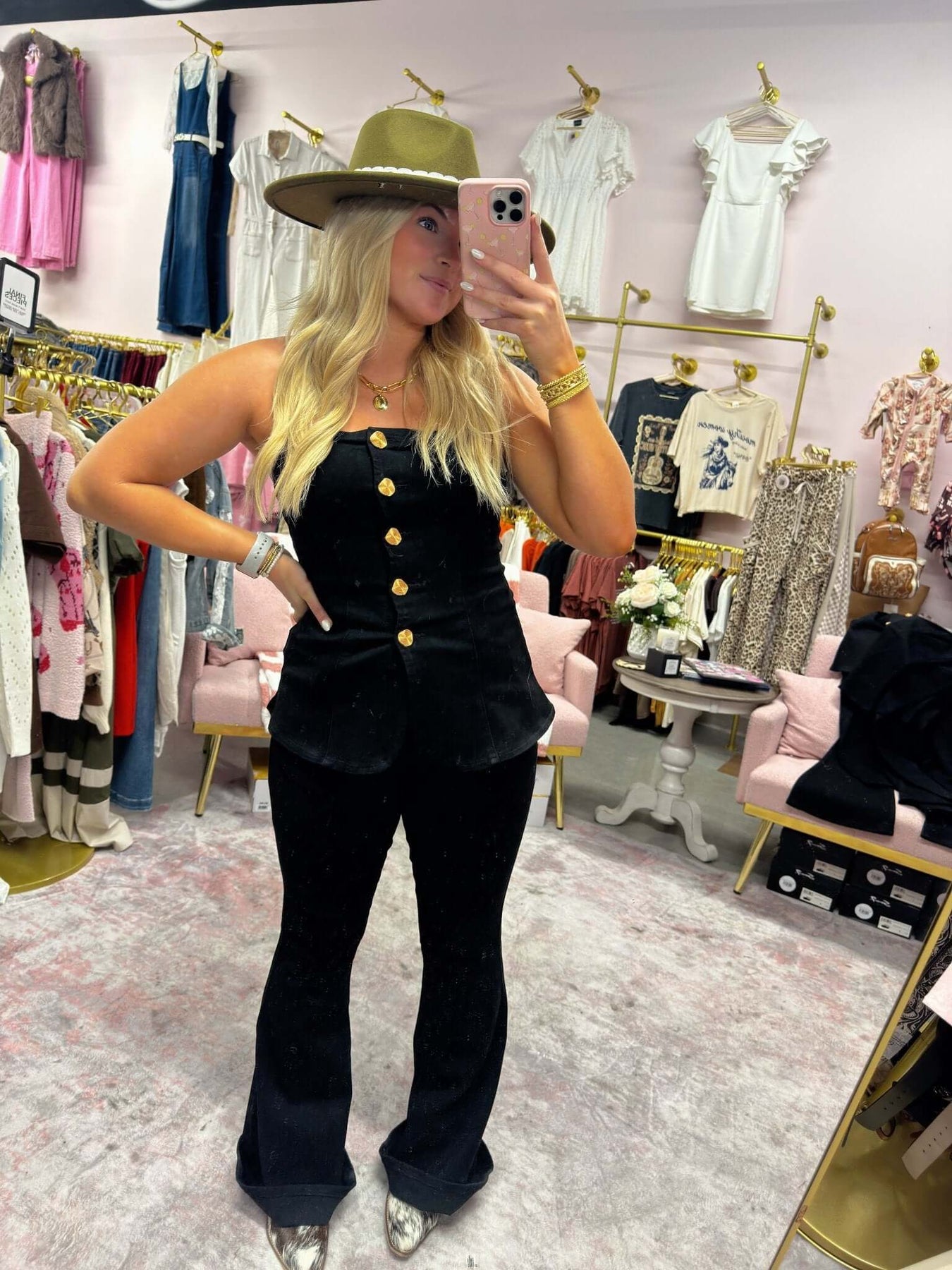 Meet your new go-to set — a super stretchy denim duo designed to flatter every curve. The fitted button-front top features gold hardware, a structured shape, and a smooth, comfortable feel. Paired with matching high-rise flare pants, this set gives you a timeless, elongating silhouette with all-day stretch.