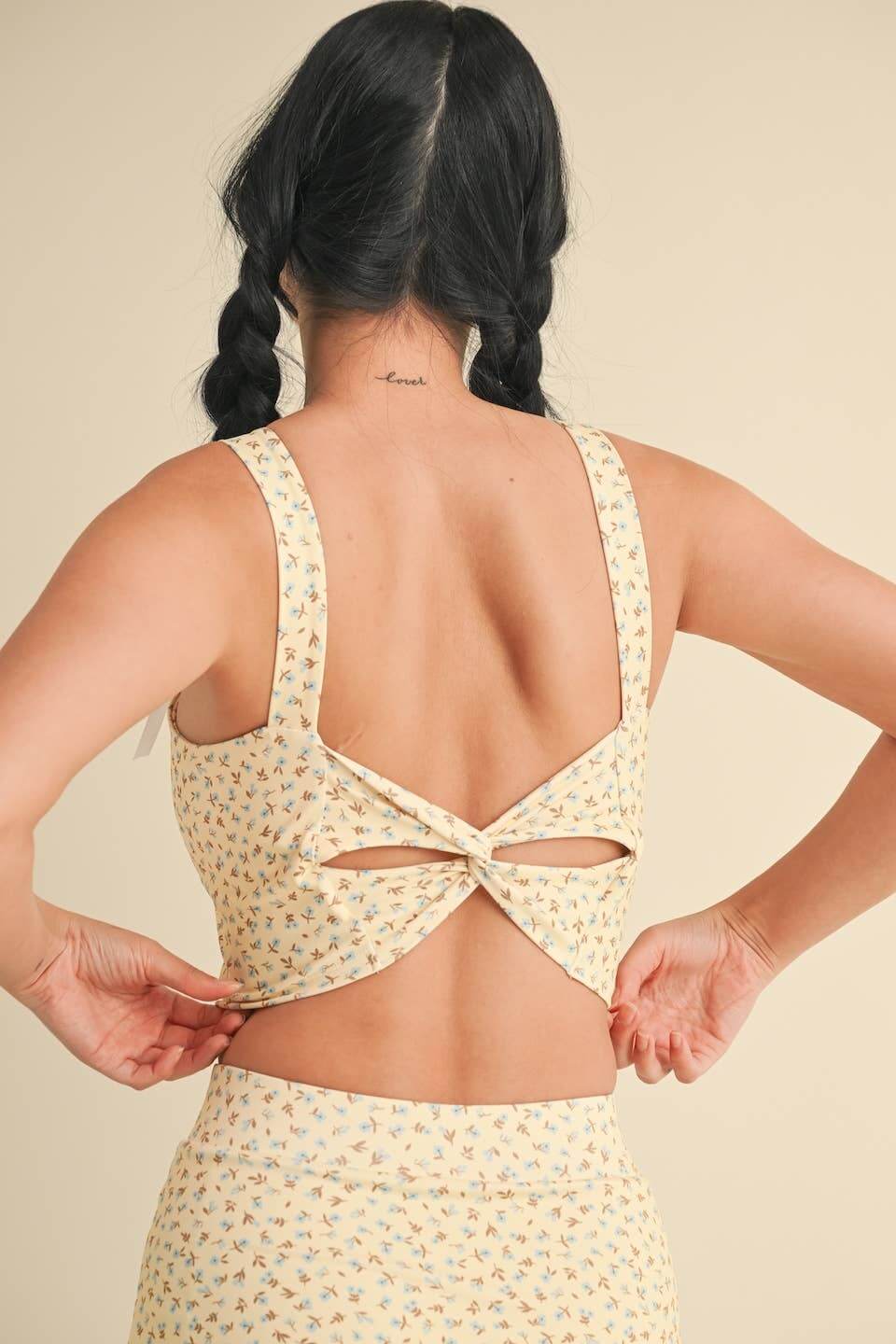 Ditsy print crop tank with a twist back, cutout detail, and removable padding. 82% Polyester, 18% Spandex HPS S: 15" M: 15 1/2" L: 16"