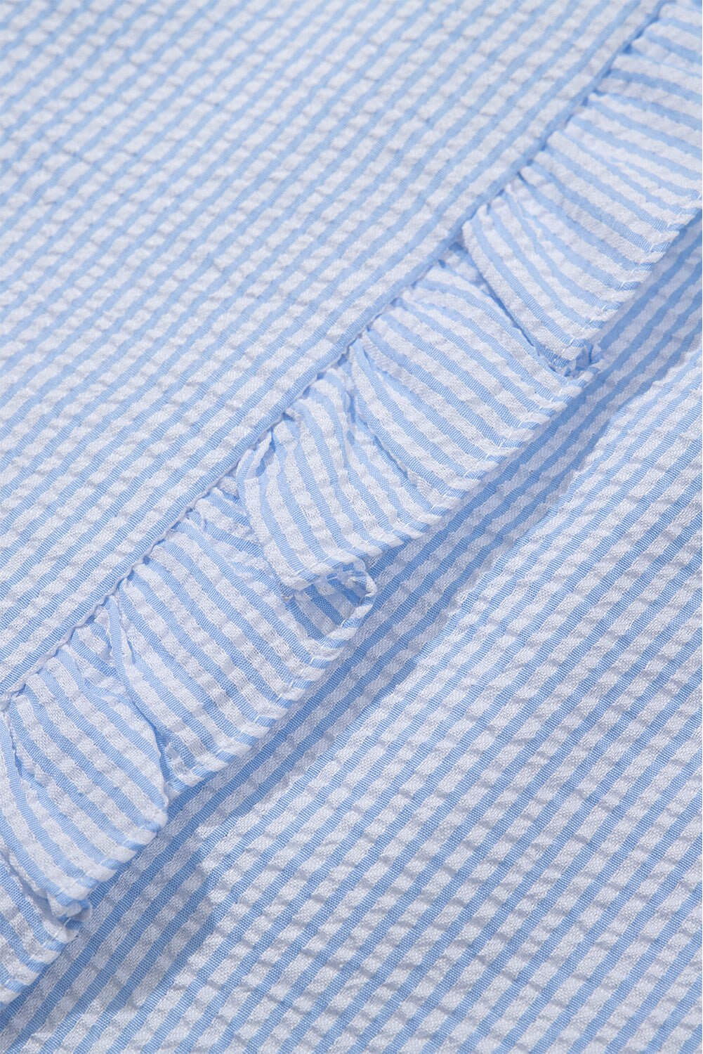 SEO Keywords: seersucker blouse, blue summer top, puff sleeve button-up, ruffle trim shirt, boutique women’s tops, southern style blouse, lightweight casual shirt