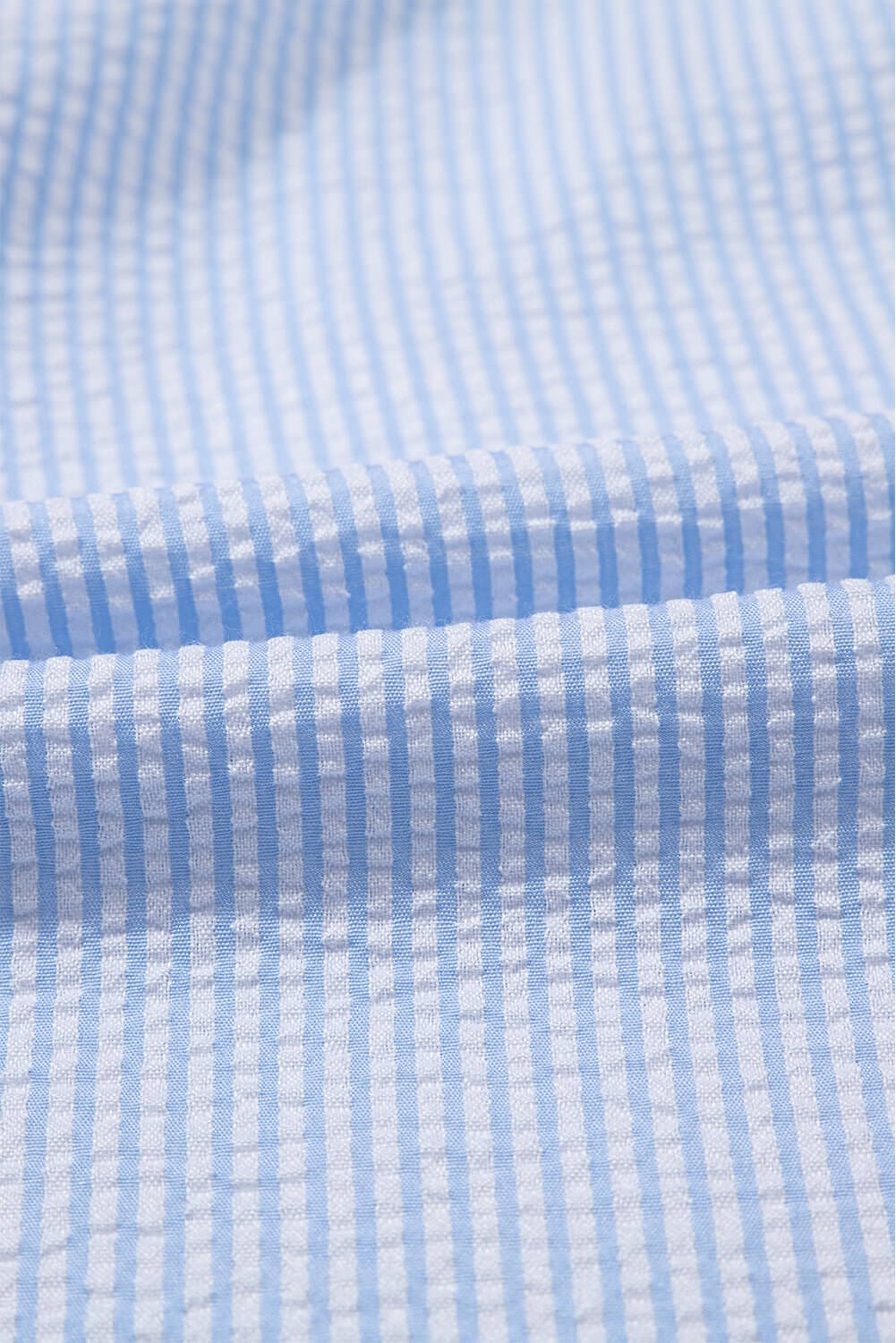 Lightweight, airy, and oh-so-feminine—our Sky Blue Seersucker Button-Up Top is your new summer go-to. Made from breathable textured fabric with subtle vertical stripes, this blouse features dainty ruffle trim, a soft collar, and charming puff sleeves. Dress it up with white denim or keep it casual with cut-off shorts. Perfect for brunch dates, beach vacations, or southern boutique fashion lovers.