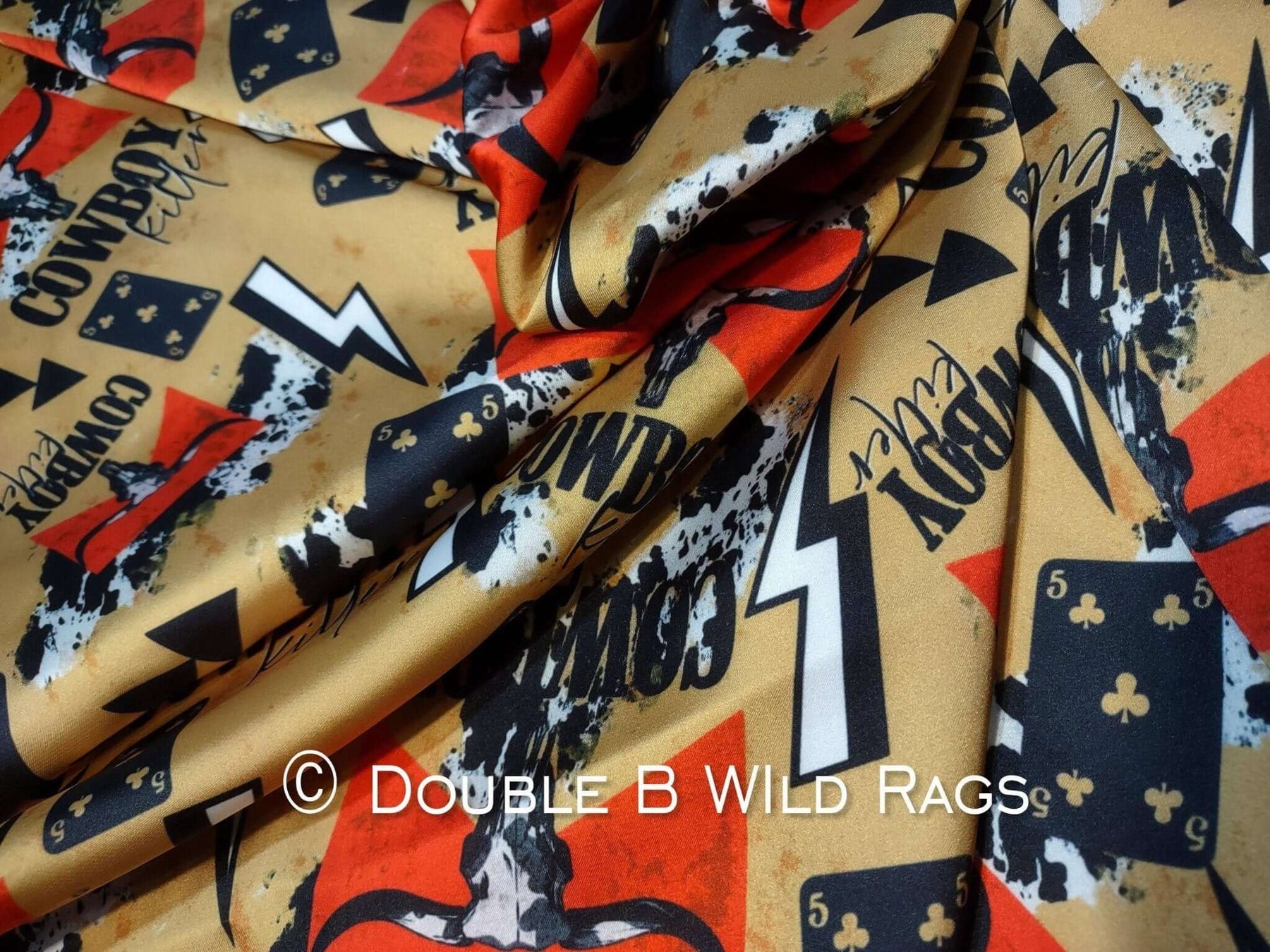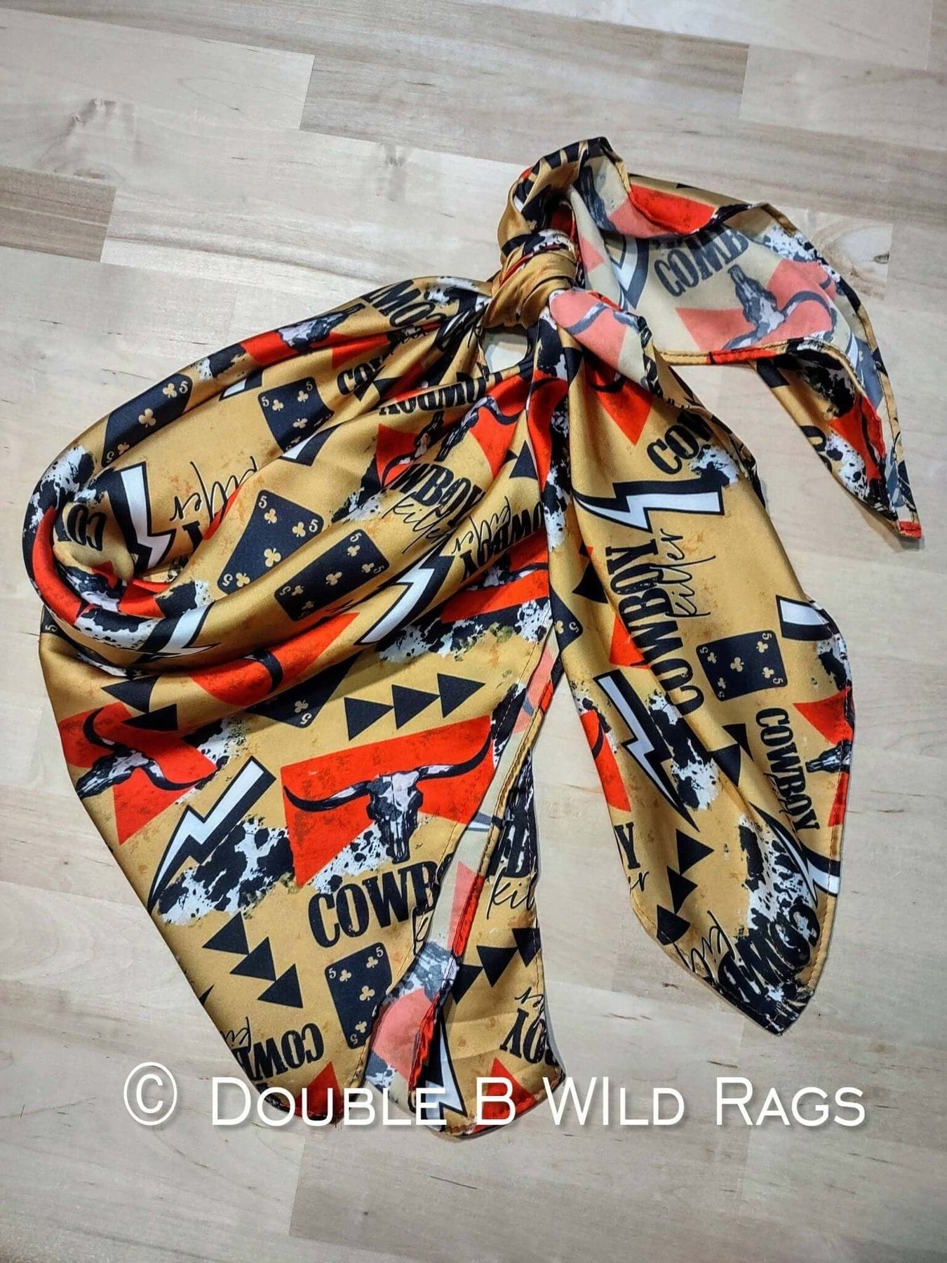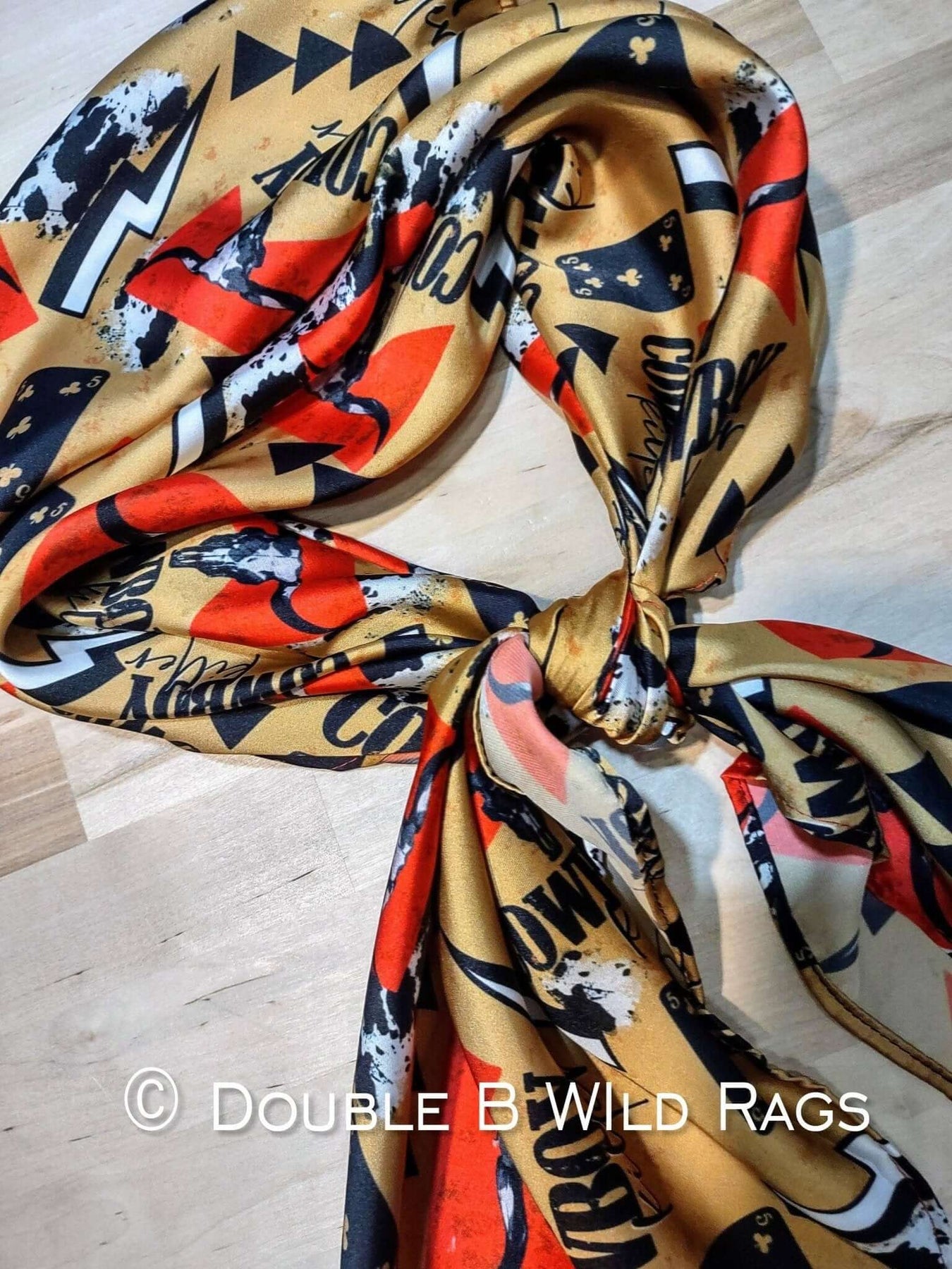 Meet your new favorite statement wild rag. The Wild Rag Gold “Cowboy Killer” scarf by Double B Wild Rags features a bold buckaroo scene in rich golden tones that instantly elevates any outfit—from rodeo nights to everyday tee-and-denim days.