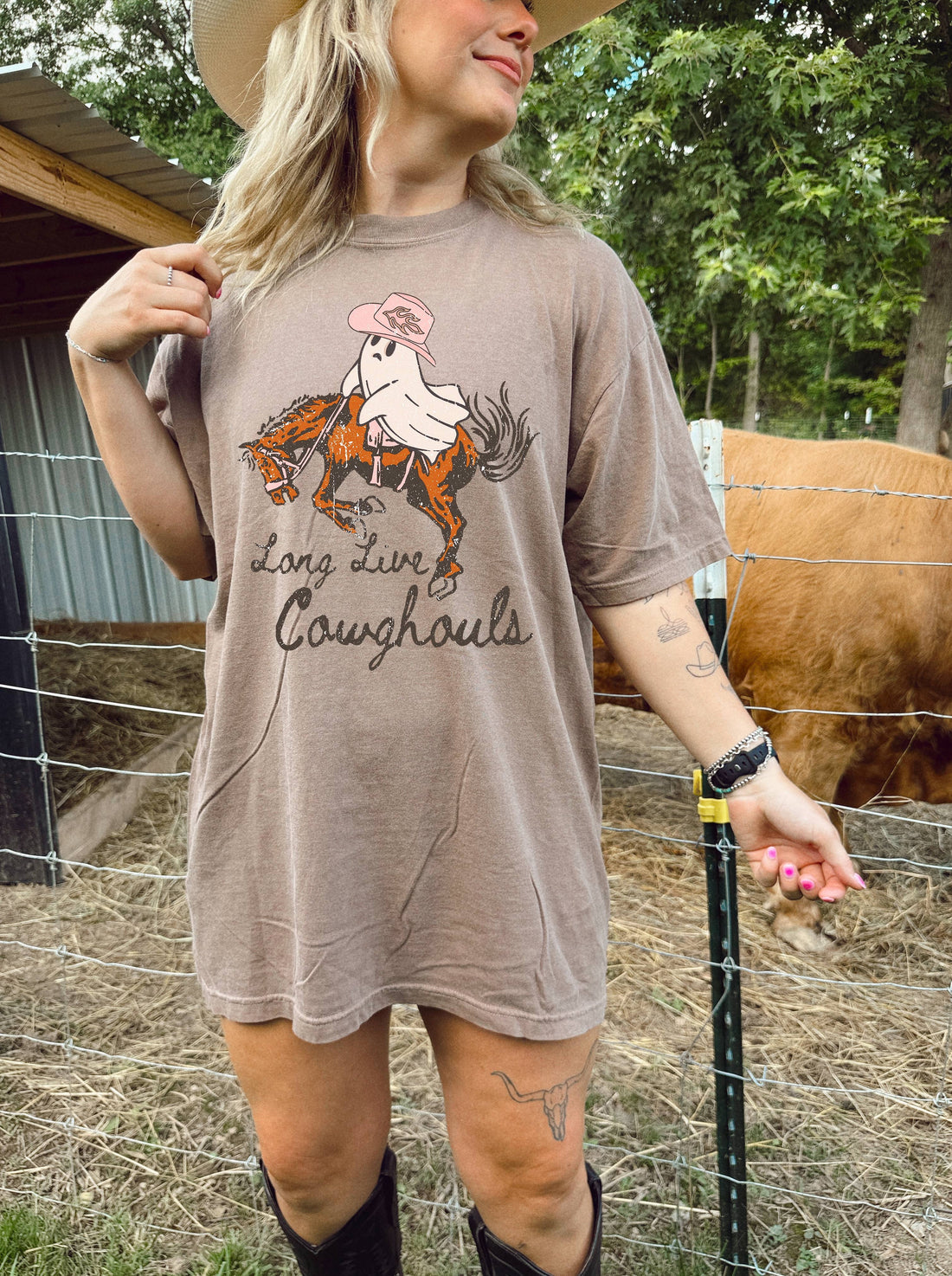 Saddle up in spooky western style with this oversized graphic tee. Featuring a playful ghost...