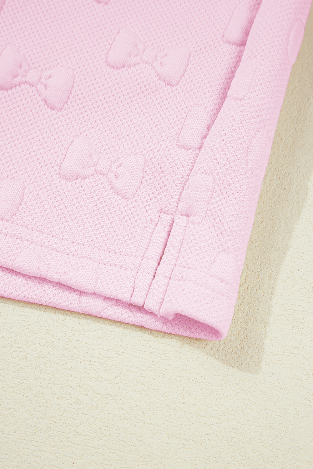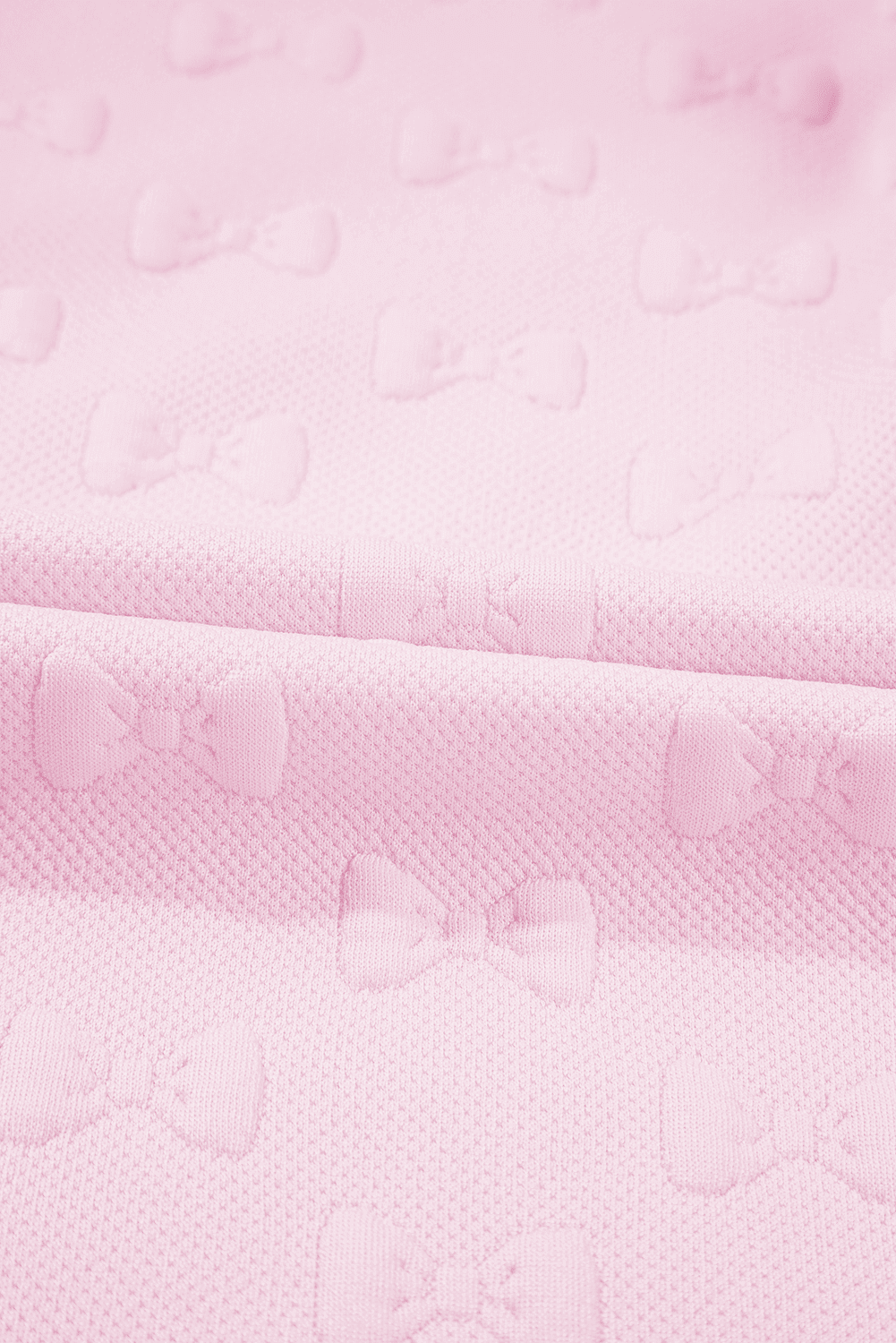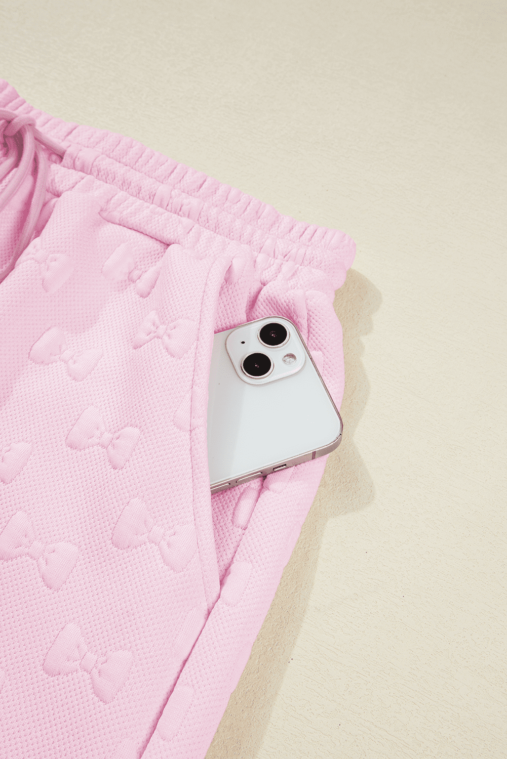 Add a little sweetness to your western wardrobe with our Pink Bow Textured Lounge Set! This darling two-piece set is full of charm, featuring a soft pink hue and an adorable embossed bow design throughout. The flutter sleeve top gives off a feminine cowgirl vibe, while the elastic-waist drawstring shorts keep you comfy and cute all day long.