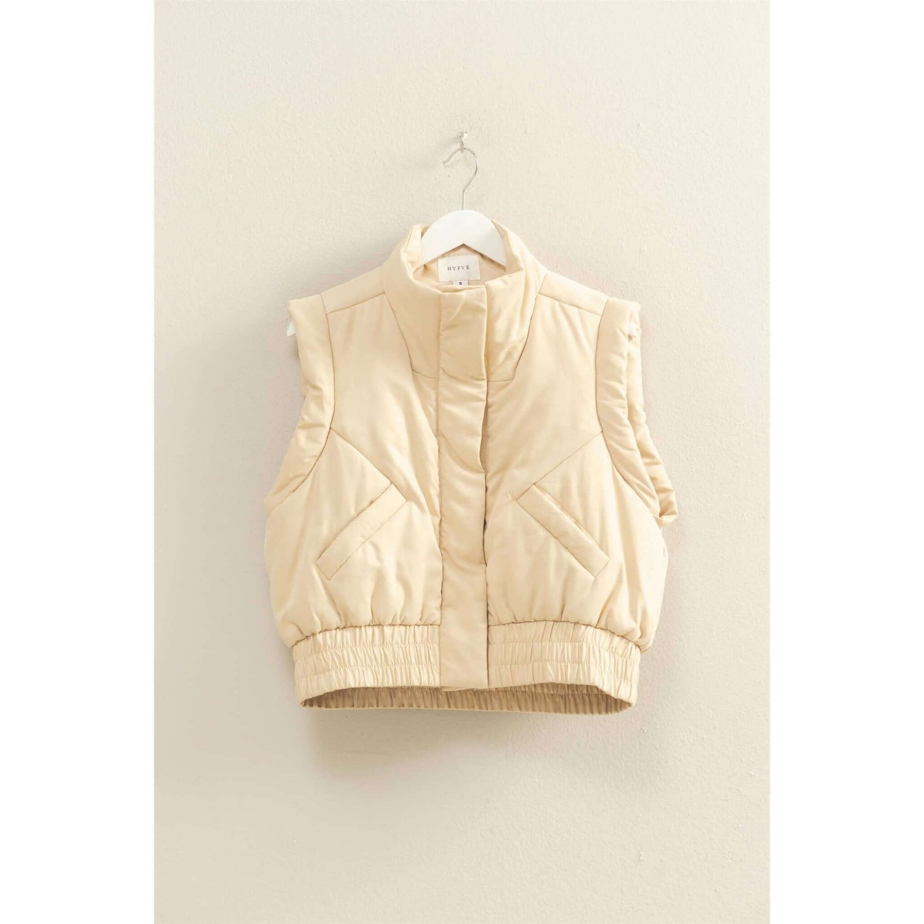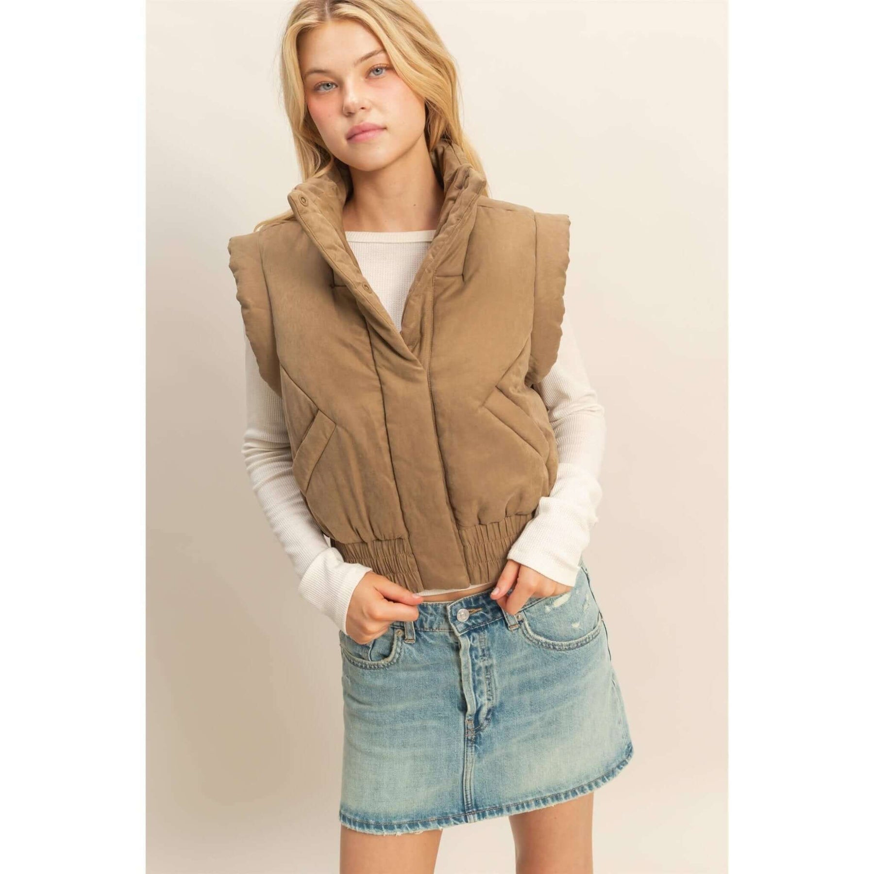 Embrace the changing seasons with this structured puffer vest. Ideal for adding warmth and style, its silhouette enhances any outfit. Layer it over long sleeves or sweaters for crisp mornings or style it with light tops for cooler evenings. Perfect for casual outings and transitional weather. Model Is 5' 7" Tall, 32" Chest, 25" Waist, 34" Hips And Wearing A Size Small Imported. Designed In The USA