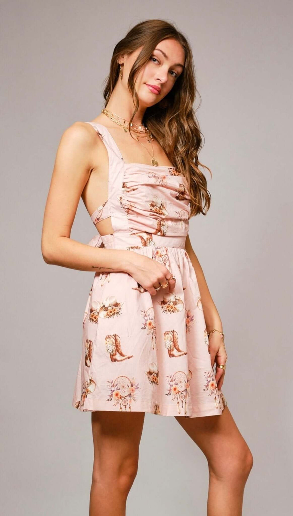 Say hello to your new summer crush—the Western Dream Ruched Mini Dress! Featuring a sweet blush pink base with an allover print of cowgirl hats, boots, dreamcatchers, and florals, this dress brings major rodeo romance vibes. The ruched bust and wide shoulder straps add flirty structure, while the open back with a self-tie bow keeps things playful and feminine. Perfect for country concerts, weekend outings, or just showing off your western charm.