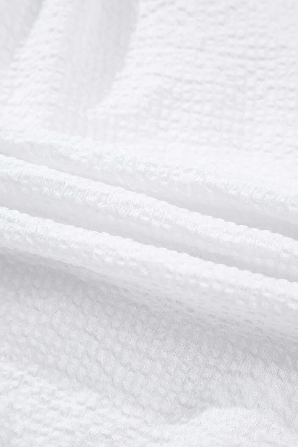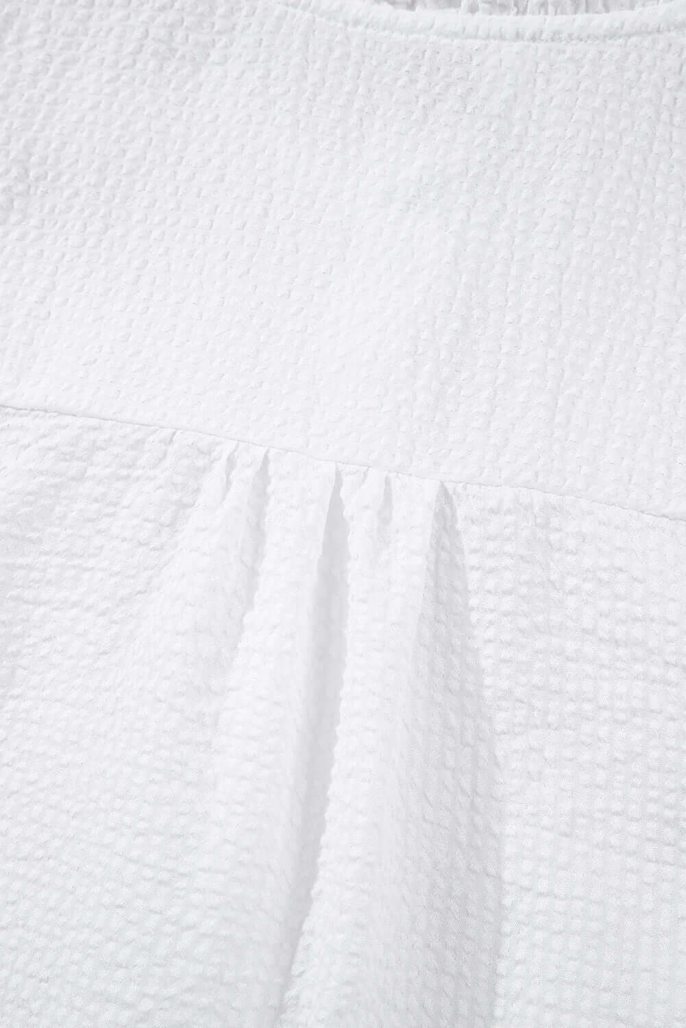 Add a fresh touch of charm to your wardrobe with our White Ruffle Front Puff Sleeve Blouse! This textured top features short puff sleeves, a feminine ruffle trim along the button front, and a subtle mock neckline for an elevated finish. Lightweight and breathable, it’s perfect for sunny days, whether you’re dressing it up with denim or keeping it casual in shorts.