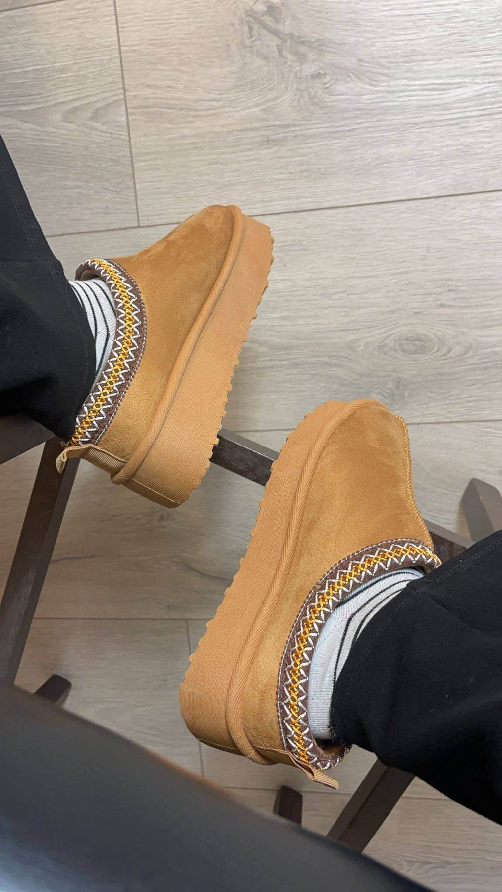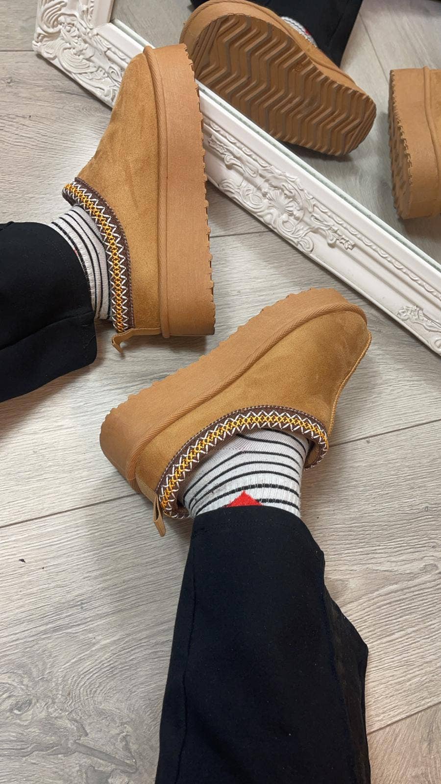 Women’s platform ankle boots featuring faux fur lining, round toe and pull tab at the back.