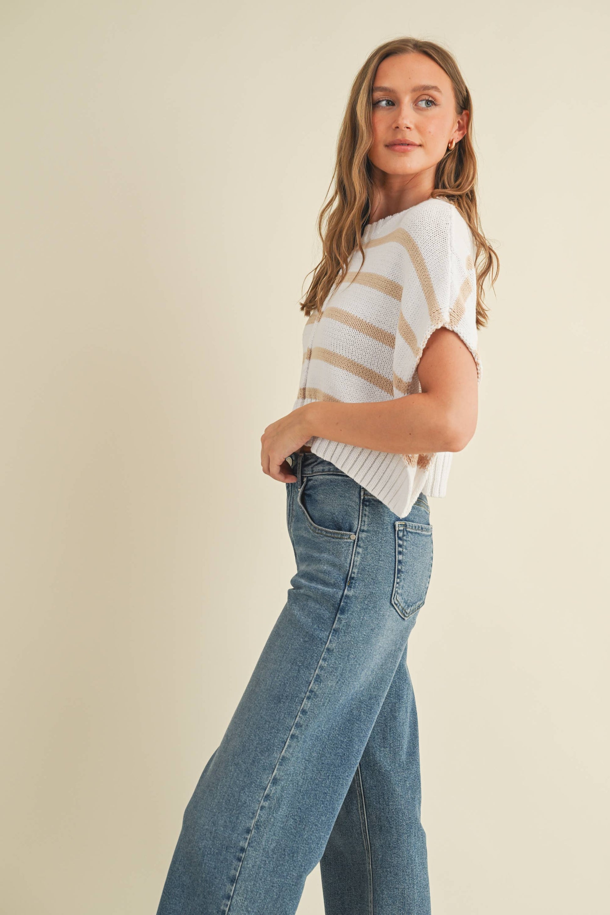 Effortlessly chic and cozy, this striped knit crop sweater top is the perfect blend of casual comfort and modern style. Designed with wide taupe and white stripes, it features a relaxed, boxy fit with a cropped hemline that pairs perfectly with high-rise jeans or shorts. The ribbed neckline and hem add a touch of texture, while the lightweight knit makes it ideal for layering or wearing solo through every season.