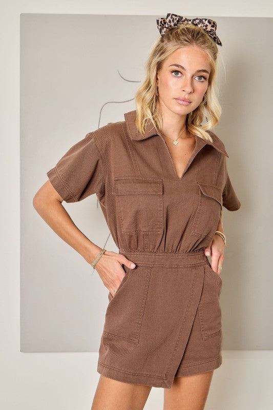 Meet your new fall favorite — this mocha brown denim romper is where chic meets effortless. Designed with a structured yet comfy fit, it features a flattering elastic waist, front flap chest pockets, and deep side pockets that keep it both functional and stylish. The wrap front detail gives it a modern twist while the collared neckline adds that perfect touch of polish.