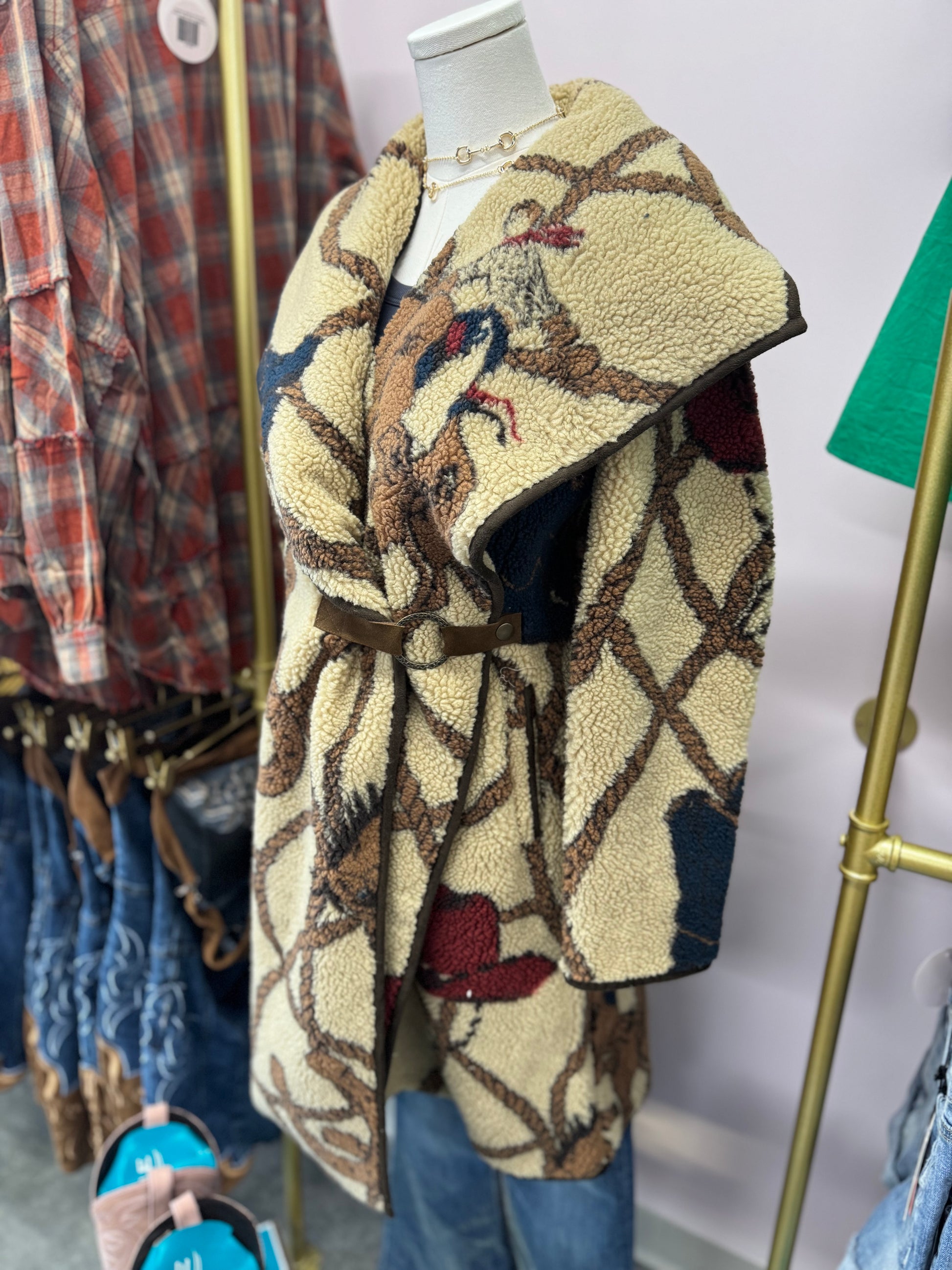 Wrap yourself in timeless Western elegance with the Tasha Polizzi Hathaway Coat in Khaki. This standout piece features a sophisticated, neutral khaki base adorned with subtle Southwestern-inspired motifs — a perfect fusion of rugged charm and refined style.