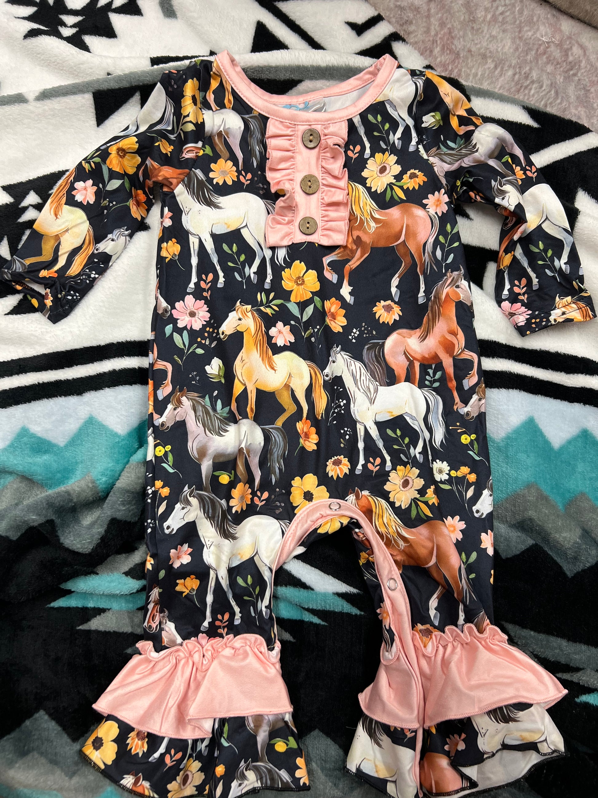 Featuring a whimsical mix of galloping horses, vibrant florals, and soft pink ruffle accents, this long-sleeve romper is perfect for little ones who love to roam wild and free. The functional snap closures and stretchy, breathable fabric make dressing and changing a breeze, while the ruffled leg cuffs and button-down chest add the perfect touch of southern charm.