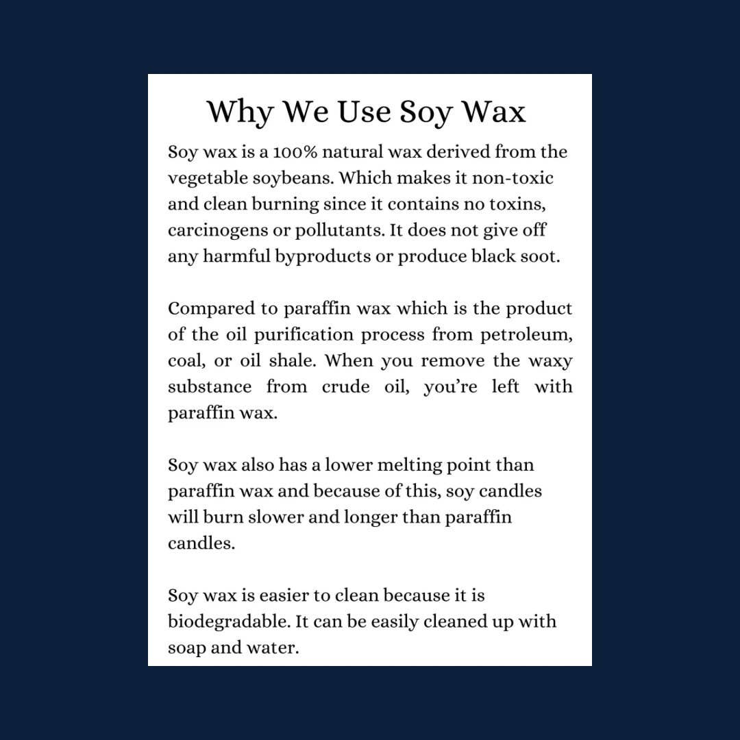 Our candles are made with all-natural soy wax free of dye and scented with non-toxic, phthalate-free fragrance oils and a eco cotton wick.