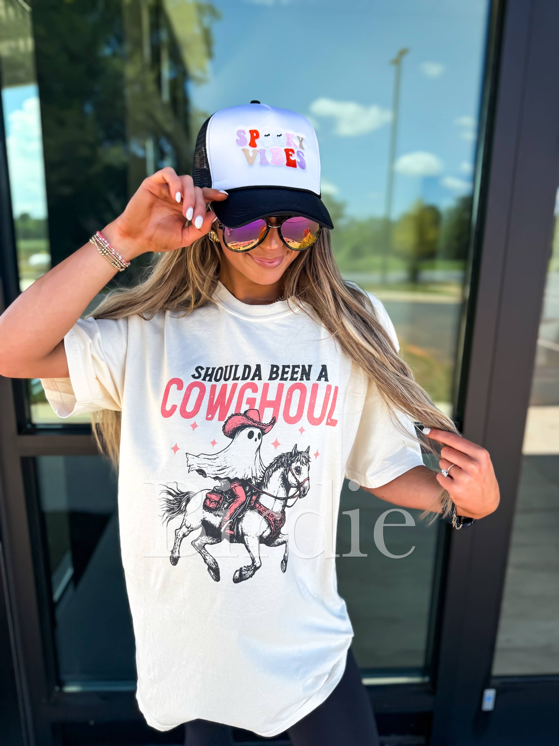 Saddle up spooky season style with our Shoulda Been a Cowghoul tee! Featuring a playful ghost in a cowboy hat riding horseback, this oversized graphic tee blends western vibes with Halloween fun. Soft, lightweight, and perfect for layering, it’s the ultimate statement piece for pumpkin patches, rodeos, or cozy fall nights. Pair it with leggings, denim, or boots for a look that’s hauntingly cute and effortlessly cowgirl-chic.