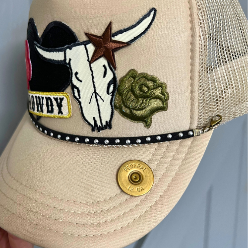 Studded leather hat chain. Brown, black, turquoise, red or pink.